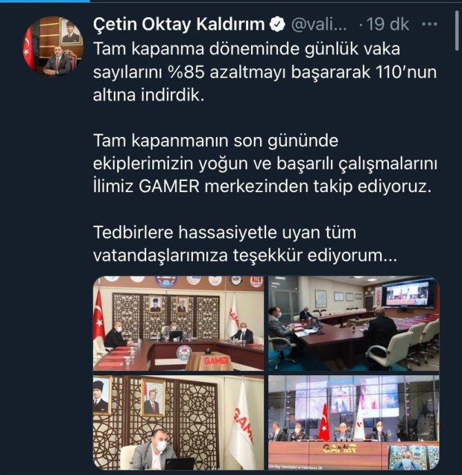Ramazan ayının başlaması ve tam kapanma kararı ile birlikte Sakarya'da alınan sıkı tedbirler meyvelerini vermeye başladı. Şehrin dört bir noktasında uygulamalar devam ederken, Sakarya Valisi Çetin Oktay Kaldırım sosyal medya hesabından tam kapanma döneminde vaka sayısında yaşanan azalışı açıkladı. Vali Kaldırım sosyal medya hesabından yaptığı paylaşımda, "Tam kapanma döneminde günlük vaka sayılarını yüzde 85 azaltmayı başararak 110'nun altına indirdik. Tam kapanmanın son gününde ekiplerimizin yoğun ve başarılı çalışmalarını ilimiz GAMER merkezinden takip ediyoruz. Tedbirlere hassasiyetle uyan tüm vatandaşlarımıza teşekkür ediyorum" ifadelerine yer verdi.