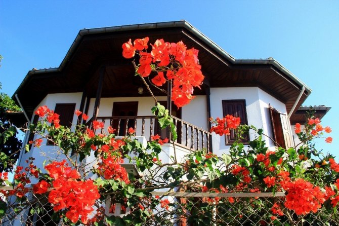 Akyaka mimarisinin güzelliğini tamamlayan en büyük unsur Begonvil çiçekleri. Akdeniz iklimine has Begonvil çiçekleri tek tip mimarisi ile dikkat çeken evleri sarmalarken, yaz kış rengarenk açarak evlerin bahçe duvarlarını süslüyor. Yeşilin tonu ile ayrı bir güzelliğe bürünen Akyaka, her mevsim renk renk açan Begonvil çiçekleri ile özellikle emekli kesimin kış aylarında tatil tercihini ilk sırada kullandığı bil turizm merkezi haline geldi.