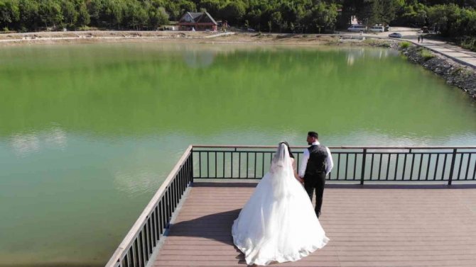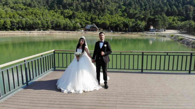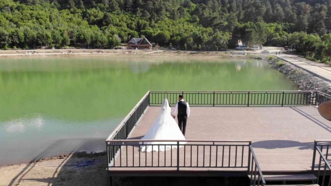 Çorum'un Laçin ilçesinde doğal güzelliği ile büyüleyen ve "gizli cennet" olarak adlandırılan Yeşilgöl, gelin ve damatların stüdyosu haline geldi.