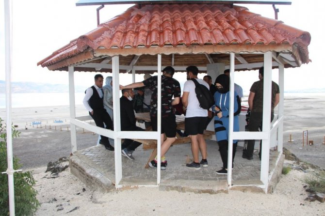 Kademeli normalleşme ile birlikte Salda Gölü ziyaretçilerini ağırlamaya başladı. Salda Gölü'ne ziyarete gelen nişanlı çift ve beraberindekiler, yağmurun yağması ile birlikte göl kıyısında bulunan kamelyaya sığındı.