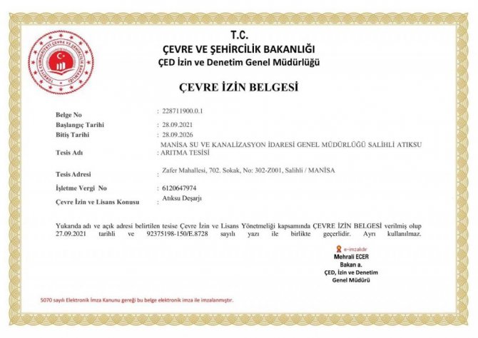 Manisa Su ve Kanalizasyon İdaresi (MASKİ) Genel Müdürlüğü bünyesinde başarılı bir şekilde işletilen Salihli Atıksu Arıtma Tesisinin Çevre İzin Belgesi...