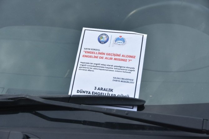 Salihli Belediyesi Zabıta Müdürlüğü tarafından şehir merkezinde bulunan engelli geçişlerine park eden araçlarla ilgili bir çalışma gerçekleştirildi. Uygulama kapsamında, Zabıta ekipleri kaldırımlardaki engelli geçişlerine park yapan araç sürücülerine, “Sayın sürücü, engellinin geçişini aldınız engelini de alır mısınız? Hepimizin bir engelli adayı olarak yaşadığımız dünyada engelli vatandaşlarımızın hayatını kolaylaştıran engelli geçişlerini bir daha kapatmamanızı, onların farkında olmanızı dileriz.” yazılı broşürler dağıtarak sürücüleri bilgilendirdi.