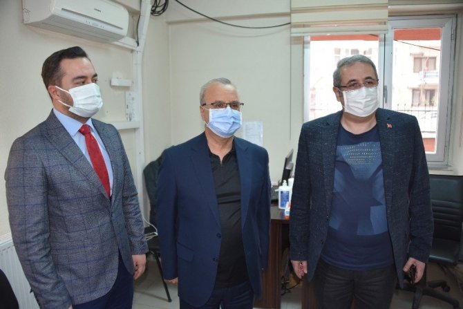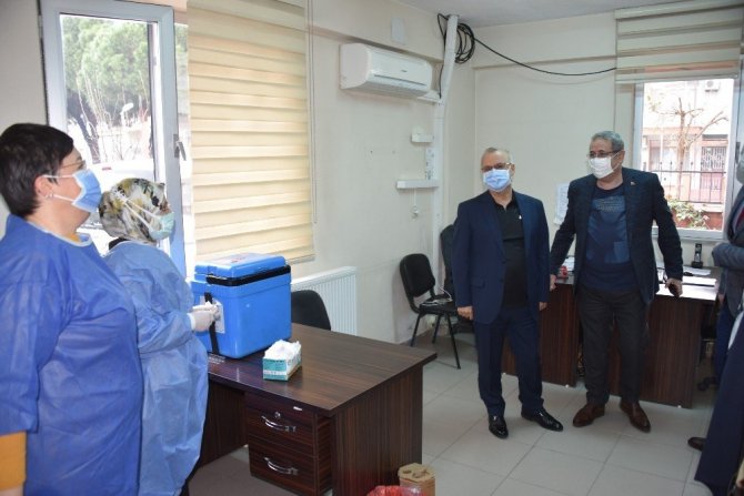 İlçe Sağlık Müdürlüğü çalışanlarına kolaylıklar dileyen Kaymakam Sağlam ve Başkan Kayda, yeni tip korona virüse karşı ilk doz aşıları olarak aşıyı yapan sağlık personeline teşekkür etti.