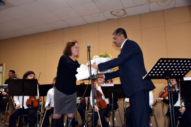 Müdür Turunç, Keman eğitmeni Coşkun Kandaş’a ve tüm kursiyerlere çiçek takdim ederek tebrik etti.