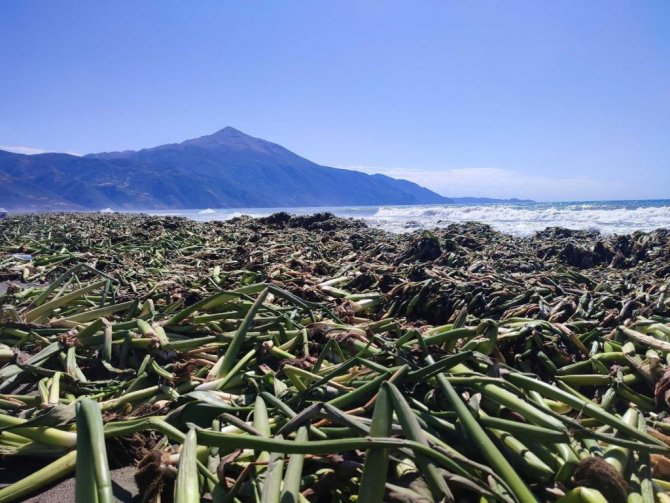 Hatay'ın Samandağ ilçesinde bulunan 14 kilometrelik sahilin 6 kilometrelik bölümünü su sümbülleri kapladı. Kumsaldaki su sümbülleri ilginç görüntüler oluşturdu.