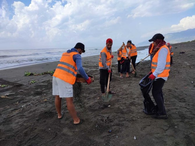 Hatay'ın Samandağ ilçesi sahillerinde Çevre ve Şehircilik İl Müdürlüğü ekipleri, 2 Eylül'de başlayan temizlik çalışmalarını sürdürüyor.20 kişilik ekip, tırpan ve kürek kullanarak kumsaldan topladıkları atıkların kumlarını eleyip çuvallara dolduruyor.