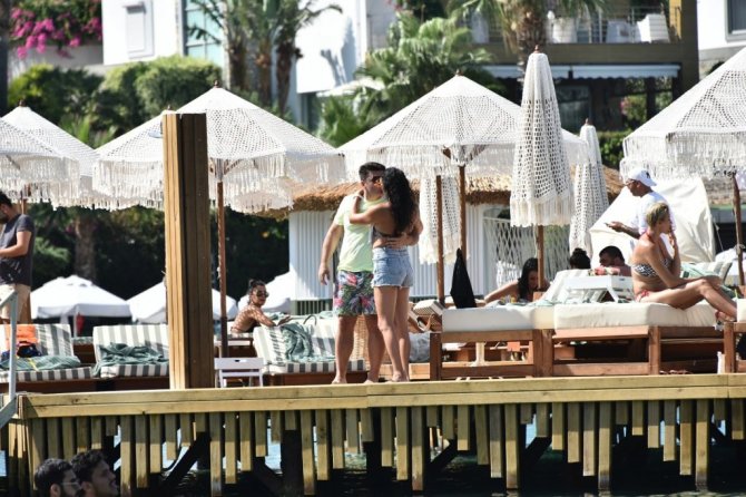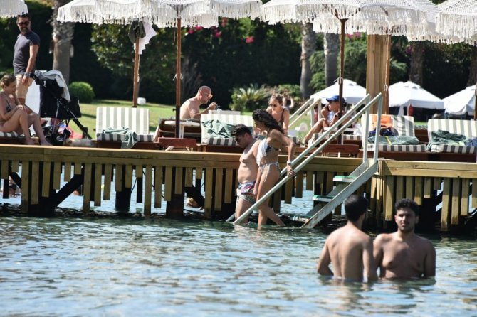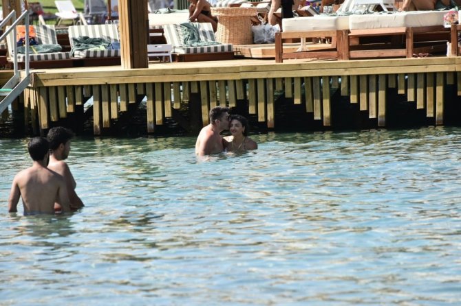 Şampiyon çift iskelede antrenman yaptıktan sonra Bodrum'un serin sularına kendilerini bırakırken, birbirlerini ise öpücük yağmuruna tuttu.