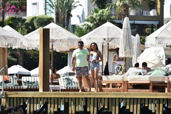 Türkiye'nin ilk bayan boksörü, Kickboks ve Muaythai dünya şampiyonu Nurhayat Hiçyakmazer Deniz, kendi gibi şampiyon olan "Pitbull" lakaplı Türkiye ve Dünya Şampiyonu eşi Erhan Deniz ile birlikte önceki gün Bodrum Yalıkavak'taki Miya Beach'te görüntülendi. İskelede bol bol güneşlenen ünlü çift, denize girmeden önce kısa bir antrenman yaptıktan sonra soluğu denizde aldı. Uzun süre denizde yüzerek keyifli anlar yaşayan ikili, birbirini öpücük yağmuruna tuttu.