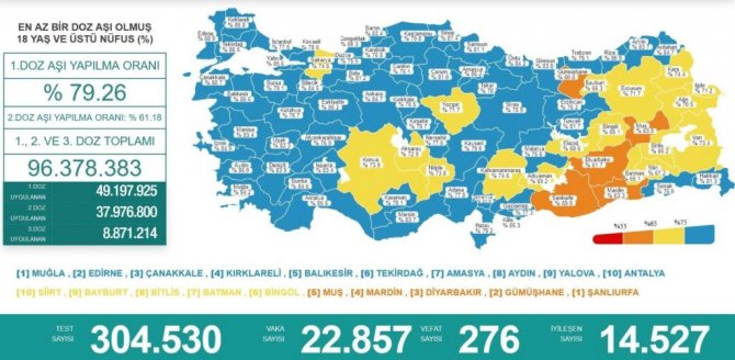 Türkiye genelinde 1. doz aşı yapılma oranı yüzde 79,26 oldu. 2. doz aşı yapılma oranı yüzde 61,18 olurken birinci, ikinci ve üçüncü doz toplamı 96 milyon 378 bin 383 oldu. Öte yandan 49 milyon 197 bin 925 birinci doz, 37 milyon 976 bin 800 ikinci doz ve 8 milyon 871 bin 214 doz da üçüncü doz aşı uygulandı.