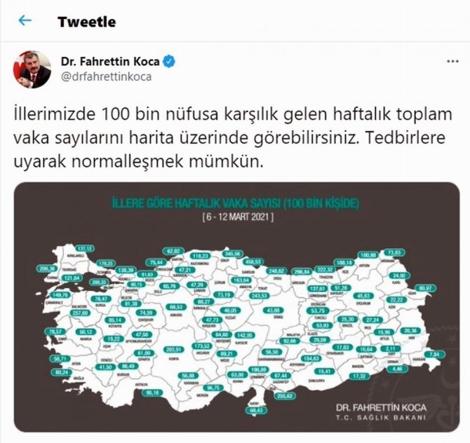"İllerimizde 100 bin nüfusa karşılık gelen haftalık toplam vaka sayılarını harita üzerinde görebilirsiniz. Tedbirlere uyarak normalleşmek mümkün."