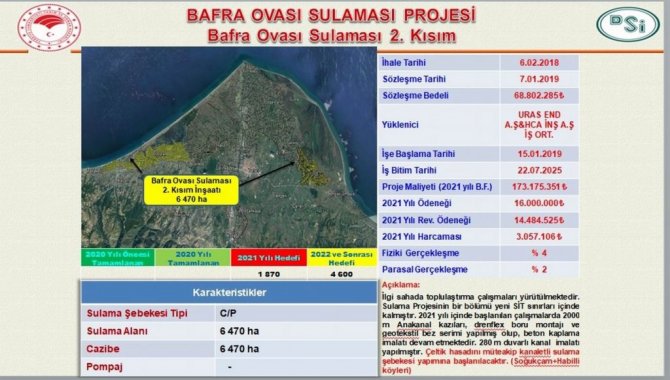 DSİ 7. Bölge Müdürlüğü sulama projeleri kapsamında 173 milyon 175 bin TL proje bedelli Bafra Ovası Sulaması 2. Kısım Projesi'nin yüzde 4'ünü tamamladı. İlgili sahada toplulaştırma çalışmaları yürütülüyor. Sulama projesinin bir bölümü yeni SİT sınırları içinde kaldı. 2021 yılı içinde başlanılan çalışmalarda 2 bin m ana kanal kazıları, drenflex boru montajı ve geotekstil bez serimi yapılmış, beton kaplama imalatı ise devam ediyor. 280 m duvarlı kanal imalatı yapıldı. Çeltik hasadını müteakip kanaletli sulama şebekesi yapımına (Soğukçam ve Habilli Mahalleleri) başlanılacak. Bafra Ovası Sulaması 2. Kısım inşaatı 6 bin 470 hektar alanı kapsıyor.