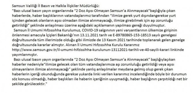 Samsun Valiliği İl Basın ve Halkla İlişkiler Müdürlüğü'nden yapılan yazılı açıklamada, "Bazı ulusal basın yayın organlarında "2 Doz Aşısı Olmayan Samsun'a Alınmayacak" başlığıyla çıkan haberlerde, haber başlıklarının vatandaşlarımız tarafından "ilimize gerek yurt dışından gerekse yurt içinden gelecek olanların aşısı olmadan ilimize alınmayacağı, ilimize girebilmek için aşı zorunluluğu getirildiği" şeklinde anlaşılması üzerine aşağıdaki açıklamanın yapılması gereği duyulmuştur: