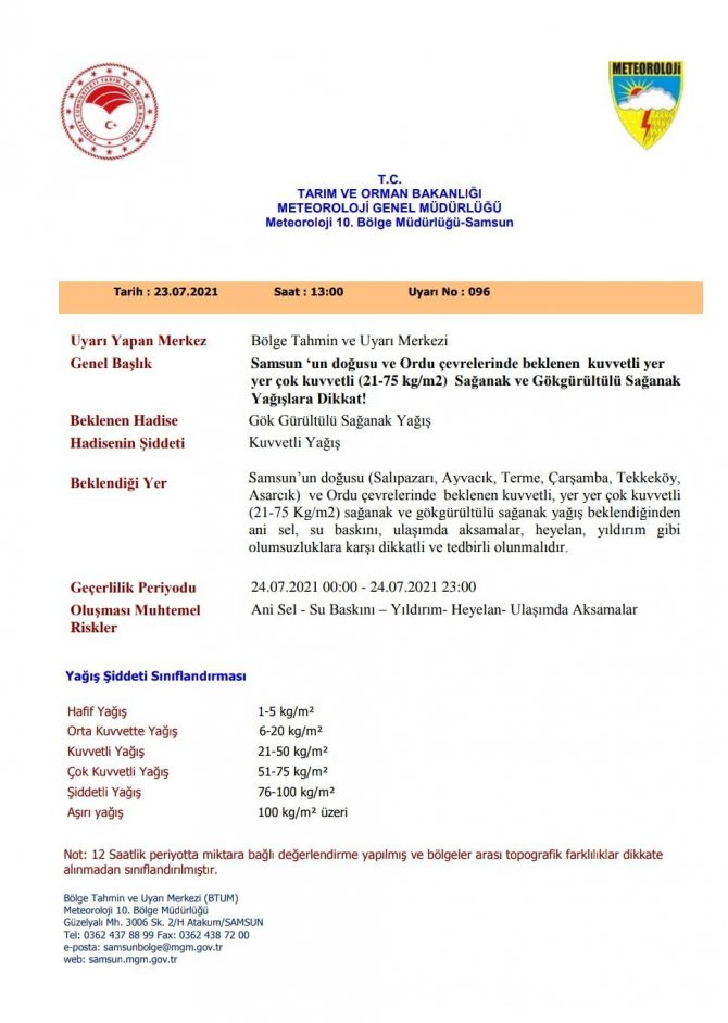 "Meteoroloji Genel Müdürlüğünün son değerlendirmesine göre 24 Temmuz Cumartesi günü 00.00-23.00 saatleri arasında Çarşamba, Salıpazarı, Tekkeköy, Terme ve Ayvacık ilçelerimizde kuvvetli ve yer yer çok kuvvetli yağış beklendiğinden muhtemel olumsuzluklara karşı tedbirli olunmalıdır."