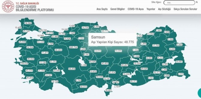 Türkiye'de 14 Ocak'ta başlayan aşılama uygulaması, "Kovid-19 Aşısı Bilgilendirme Platformu" üzerinden anbean takip edilebiliyor. Şu ana kadar 2 milyon 445 bin 445 kişinin aşılandığı bilgisine yer verilen sitede ayrıca Türkiye'nin aşı haritası da bulunuyor. Sağlık Bakanı Dr. Fahrettin Koca ve bilim kurulu üyelerinin başlattığı aşılama süreci kademeli olarak devam ediyor. Platform üzerinde ayrıca aşılama haritası da bulunuyor. Türkiye'deki tüm illerin yer aldığı haritada, nerede ne kadar aşı yapıldığı bilgisi görülebiliyor. Verilere göre Karadeniz Bölgesi'nde en çok aşılama Samsun'a yapılırken, Karadeniz Bölgesi'nde bulunan toplam 18 ilde şu ana kadar 280 bin 688 kişi aşılandı.