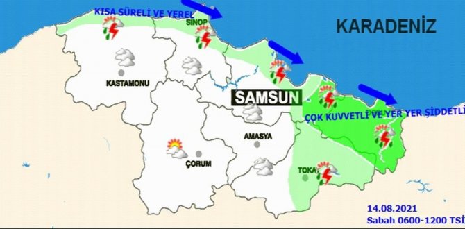 Meteoroloji 10. Bölge Müdürlüğü tarafından yapılan uyarılarda Samsun'un bugün (Cumartesi) için parçalı ve çok bulutlu, akşam saatlerine kadar aralıklı ve yerel sağanak ve gök gürültü sağanak yağışlı olması tahmin ediliyor.