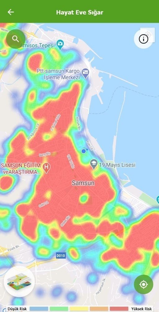 Samsun'da "Hayat Eve Sığar Uygulaması'ndan (HES) 3 Aralık ve 24 Aralık tarihlerinde 3 hafta zaman aralığıyla alınan görüntüler korona virüsünde vaka sayısındaki düşüşü gözler önüne serdi. HES uygulamasındaki yoğunluk haritasında 3 hafta önce kırmızının hâkim olduğu, bazı yerlerde ufak yeşil noktaların olduğu gözlemlenebiliyordu. Bugün korona virüsü yoğunluk haritasında risk yoğunluğunun azalmasıyla az olan yeşil alanların çoğalmaya başladığı görülüyor.