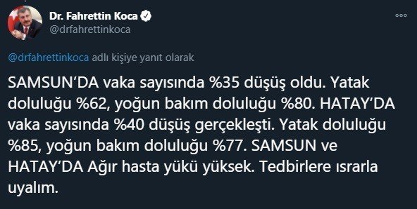 Vaka sayılarında düşüş olduğunu belirten Fahrettin Koca, ağır hasta sayısındaki yükün devam ettiğini belirtti ve uyardı. Yaptığı uyarıda şu ifadelere yer verdi: "Samsun ve Hatay'da Ağır hasta yükü yüksek. Tedbirlere ısrarla uyalım."