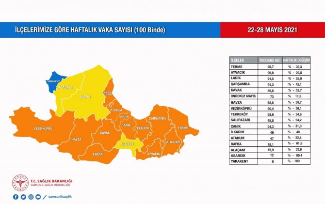 Normalleşme dönemine geçilen bu dönemde Samsun halkının daha dikkatli olması gerektiğinin altını çizen Samsun İl Sağlık Müdürü Dr. Öğr. Üyesi Muhammet Ali Oruç, "Her ilçemiz aşının gücünü kullanma ve önlemlere uyum oranlarına göre tabloda yerlerini aldığı ve kendi korona hikâyesini yazdığı bu süreçte, özellikle bu ilçelerde yaşayan vatandaşlarımızın Samsun maviye olan yolculuğunda daha dikkatli olmalı. Normalleşme dönemine geçtiğimiz bugünlerde ilimiz için daha da önem arz ediyor. Tüm Samsunlulardan beklentimiz, virüsün ne kadar kolaylıkla ilçeler arasında geçiş yaptığını ve vaka sayısını artırdığını unutmamaları; kesinlikle bu rakam düşüşünden dolayı rehavete kapılmamaları ve aşının koruma kalkanı toplumun en azından %60-70'ine ulaşana kadar önlemlere azami düzeyde uymaları. Aşı sırası gelen yakınlarını aşı olmaları için yönlendirmeleri ve destek olmaları. Aşı Covid 19'a karşı en büyük silahımız. Biz Sağlık İl Müdürlüğü olarak aşı çalışmalarımıza Sağlık Bakanlığımızın talimatları doğrultusunda hızla devam ediyoruz. İnşallah bu etkin aşı çalışması ve önlemlere uyum sayesinde nüfusumuzun büyük bir kısmını aşılayıp, önümüzdeki aylarda koronadan uzak, şehrimizin, esnafımızın, öğrencilerimizin rahat bir nefes aldığı yaz günlerine hep beraber ulaşacağız" ifadelerini kullandı.