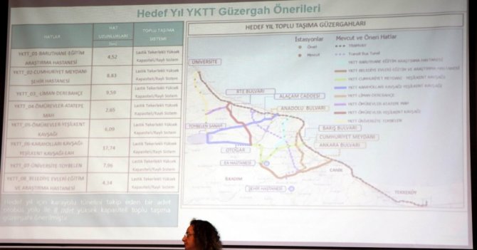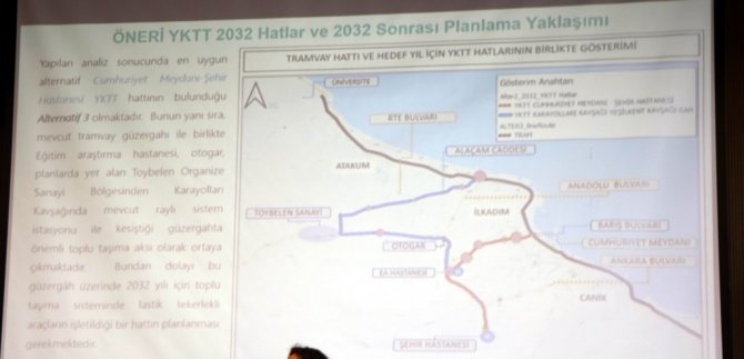 Hazırlanan planda yer altından geçecek tünel çalışmasının da olduğuna dikkat çeken Ali Dinler, "2032 yılı için karayolu ulaşım ağı hedeflerimizde 8 adet alternatif Samsun için faydalı olabileceğini düşündüğümüz yollar, karayolu ağı önerdik. Bunlardan en önemlisi Doğu Çevre Yolu ve Batı Çevre Yolu'dur. Samsun Büyükşehir Belediyesi tarafından çalışılan Ömürevleri'nden başlayarak Toybelen'e kadar giden tünel çalışması yer almaktadır. Toplamda yaklaşık 80 km'lik ulaşım ağı bu rapor neticesinde çalıştık. Yüksek kapasiteli toplu taşıma ile alakalı 8 adet toplu taşıma ağı ve hattı önerdik. Bu 8 toplu taşıma ağını hedef yıl öngörülerimizi dikkate alacak şekilde modelimizde çalıştırdık ve bunlar için en önemlisinin özellikle 2032 yılı için Cumhuriyet Meydanı ile 900 yataklı Samsun Şehir Hastanesi arasında ve Karayolları Kavşağı ile Yeşilkent, Eğitim Araştırma Hastanesi arasında hizmet vermesi planlanan hatların olacağını öngörüyoruz. Bunlar haricinde kent içerisinde trafiğin engellenmesi, trafik akışının daha hızlı sağlanabilmesi amacıyla özellikle ilçeden ve kırsaldan gelen toplu taşıma araçlarıyla veya özel araçlarla gelen vatandaşlarımızın kent içinde trafik oluşturmaması amacıyla kent merkezine yakın lokasyonlarda Alaçam Caddesi'nde, Otogar mevkisinde, Eğitim ve Araştırma Hastanesi'nde, Şehir Hastanesi'nde ve Barış Bulvarı'nın başlangıcında 5 adet transfer merkezi önerdik. Özet olarak ulaşım ana planı ile Samsun için 19 adet önerilerde bulunduk. Bunlardan bir kısmını gerçekleştirdik. Bir kısmı üzerinde de çalışmalarımız sürmekte" diye konuştu.