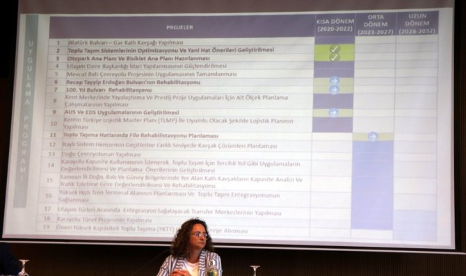 Tamamlanan planın tam anlamıyla faaliyete geçmesi için planlanan yılın 2032 yılı olduğunu ifade eden Samsun Büyükşehir Belediyesi Ulaşım Dairesi Başkanlığı Endüstri Yüksek Mühendisi Ali Dinler, "Yıllarca ulaşım ana planı için veriler toplandı. Parça parça aldığımız hizmet neticesinde diğer büyükşehirlerin bütçelerinin 10'da 1'ini kullanarak ulaşım ana planını tamamladık. Bu kapsamda 3. aşama olarak sahadan verileri topladıktan sonra 10 bin 500 kişiye sorarak hane halkı anketi gerçekleştirdik. 300'ü aşkın noktada trafik sayımları gerçekleştirdik. Bu verileri bilgisayar ortamında modelledik. Ulaşım konusunda Samsun'un talep ve beklentilerini ortaya koyan bir ulaşım modeli ve ulaşım raporunu meclis gündemine getirdik. Ulaşım ana planının içerisinde Samsun'un karayolu ile ilgili, toplu taşıma ile alakalı, taksiler, otoparklar, bisiklet yolları, yaya yolları, terminaller, aktarma merkezleri gibi birçok öneriler ve planlamalar bu raporda var. Temel çıkış noktamız hane halkı anketleri ve kent içi toplu taşıma araçları ile trafik sayım ölçümleri neticesinde öncelikle 2 aşamada ulaşım ana planının hedeflerine ulaştık. Hedef yıl dediğimiz yıl 2032 yılıdır. 15 yıllık periyotlarla 5'er yıllık yenileyerek bu planlamalar yapılır" dedi.