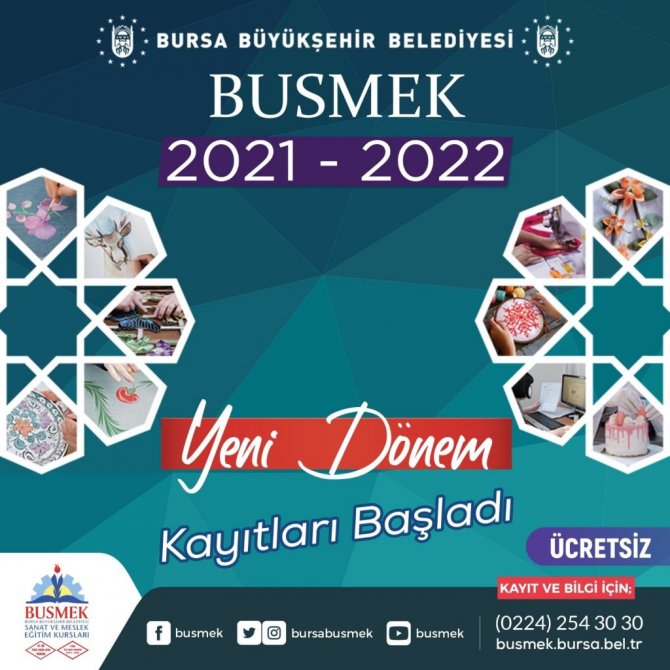 Bursa Büyükşehir Belediyesi, BUSMEK aracılığıyla yaşam boyu eğitim anlayışıyla vatandaşların sanat ve mesleki eğitim ihtiyacına çözüm olmaya devam ediyor. 27 farklı mekânda 350 branşla hizmet vermeye devam eden BUSMEK, yılda 30 bin kursiyere ulaşırken, bugüne kadar toplam 300 bine yakın kursiyere ise eğitim verdi. 2021-2022 eğitim döneminde 400 grupta nitelikli eğitimlerine hız kesmeden devam eden BUSMEK, 4 Ekim'de kapılarını tekrar kursiyerlere açmaya hazırlanıyor. Kayıt yaptırmak isteyenler busmek.bursa.bel.tr adresindeki "online başvuru" kısmına tıklayarak başvuru yapabiliyor. Aynı zamanda android tabanlı mobil uygulamaları da cep telefonlarına indirebilir ve "online başvuru" bölümünden ön kayıt yapabilir.