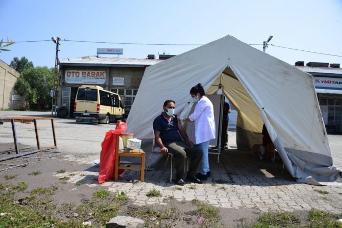 Ardahan'da sanayi çalışanlarının Covid-19 aşısı olabilmeleri için Sağlık Müdürlüğü tarafından aşı çadırı kuruldu. Aşı hizmetinin ayaklarına getirilmesinden memnuniyet duyan esnaf aşı çadırına yoğun ilgi gösterdi.