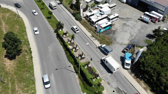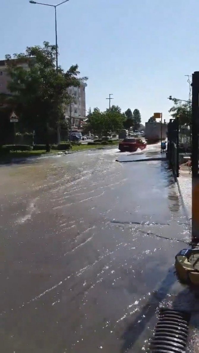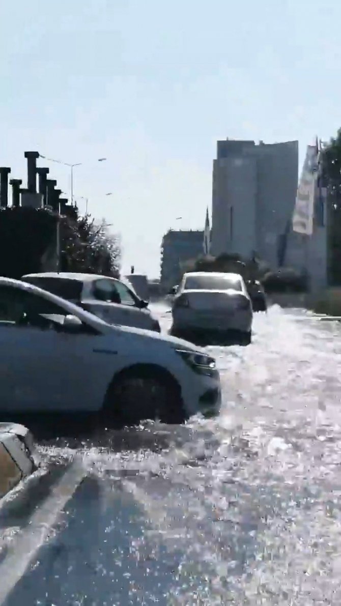 Öte yandan su fışkırmasıyla ortalığın göle döndüğü yol havadan görüntülendi.