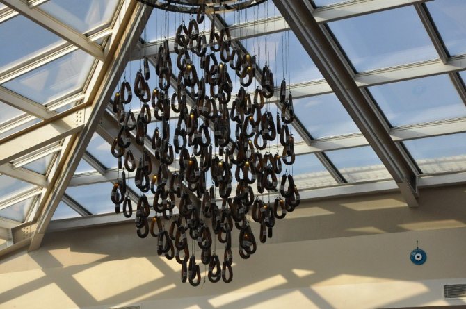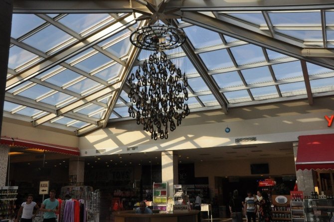 Plastik malzemeden sucuk şeklindeki avizenin özel sipariş ile yapıldığı ve 100 kangal sucuğun 100 ampul ile aydınlatıldığı belirtildi.