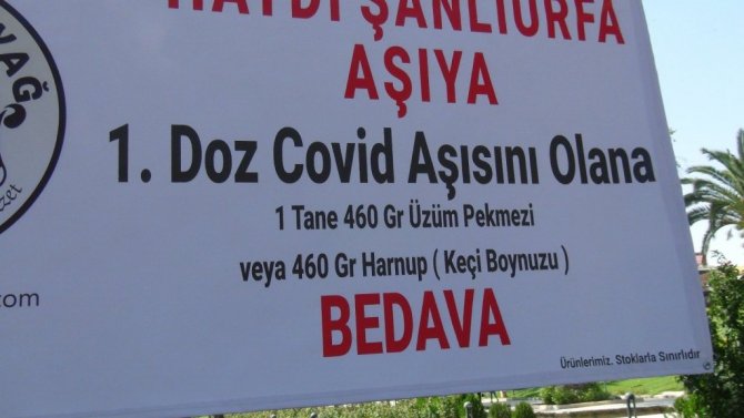 Türkiye'de korona virüs aşısının en az bir dozunu yaptıran kişi sayısı bakımından Türkiye ortalamasının altında olan Şanlıurfa'da aşıya teşvik için çeşitli kampanyalar düzenleniyor. Kentte, İl Sağlık Müdürlüğü öncülüğünde bir gıda firması tarafından korona virüs aşısı yaptıran vatandaşlara üzüm pekmezi hediye ediliyor. Tarihi ve turistik Balıklıgöl'de kurulan mobil aşı aracına aşı olmak için gelen vatandaşlar, aşıları sonrası kolonya, pekmez ve maske hediyelerini aldı. Vatandaşlar, kentte salgınla mücadele eden bütün sağlık çalışanlarına teşekkür etti.