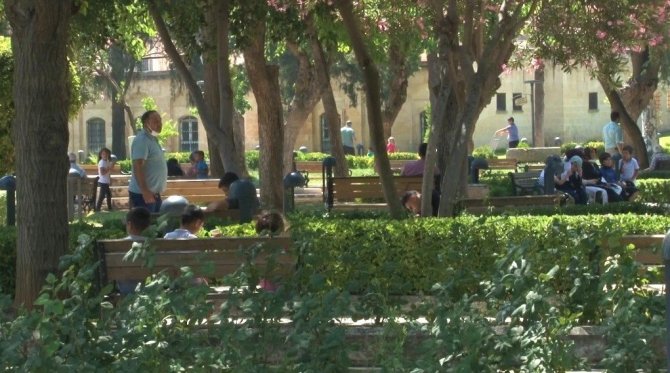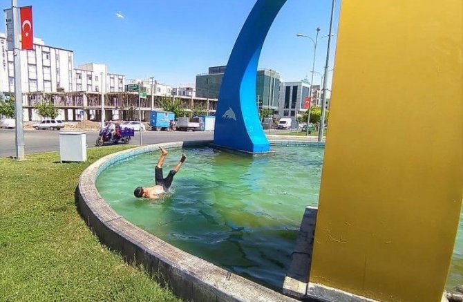 Şanlıurfa'da 40 dereceyi bulan hava sıcaklığı nedeniyle çocuklar süs havuzlarına girip serinlerken, büyükler ise gölgelik alanlara akın etti.