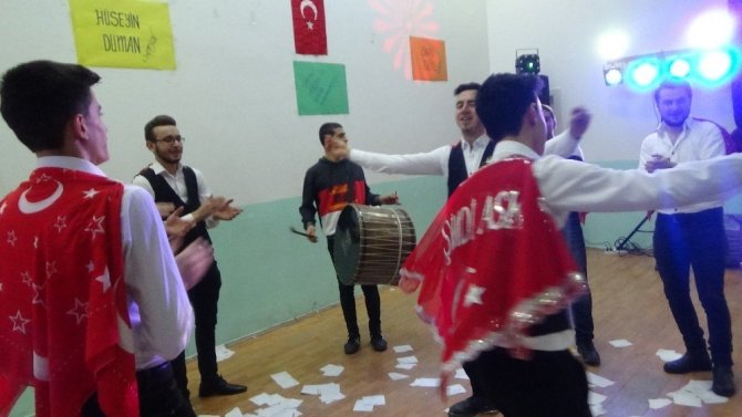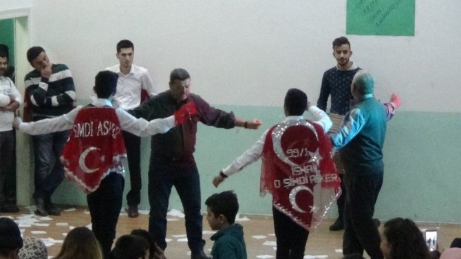 Daha sonra Belediye Sinema Salonu’da düzenlenen asker ailelerinin ve ilçe halkının katıldığı geleneksel asker eğlencesinde, omuzlara ay yıldızlı şal takan asker adaylarına kına töreni yapılıyor.