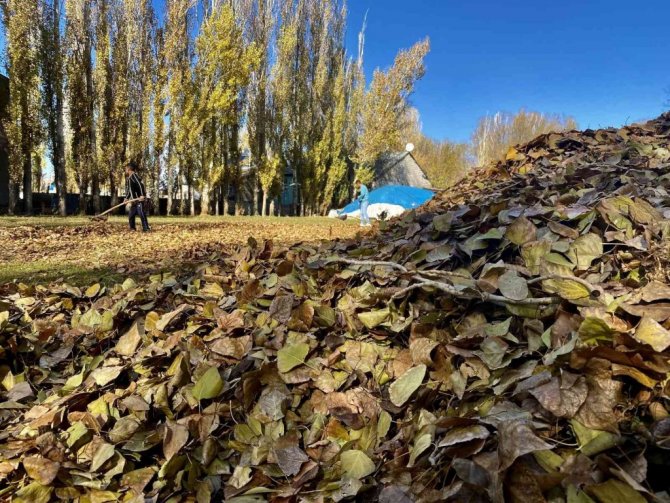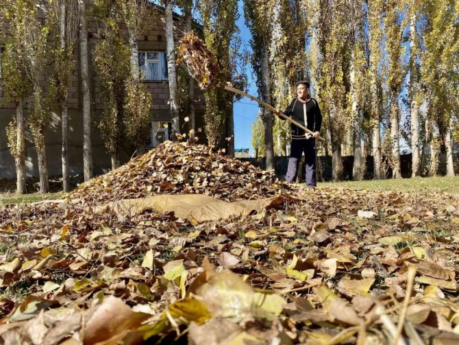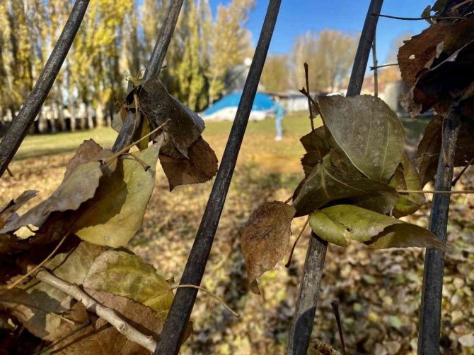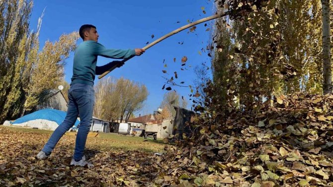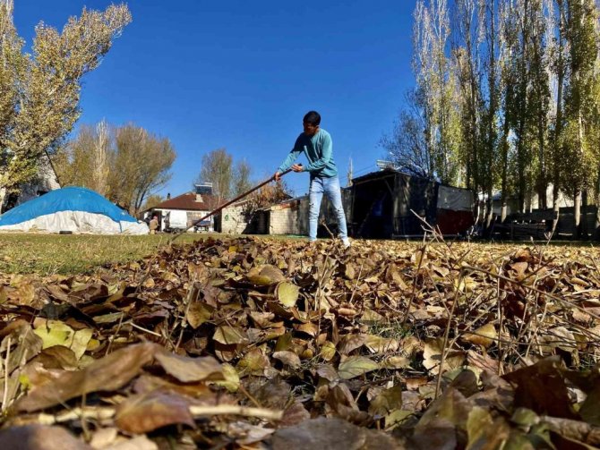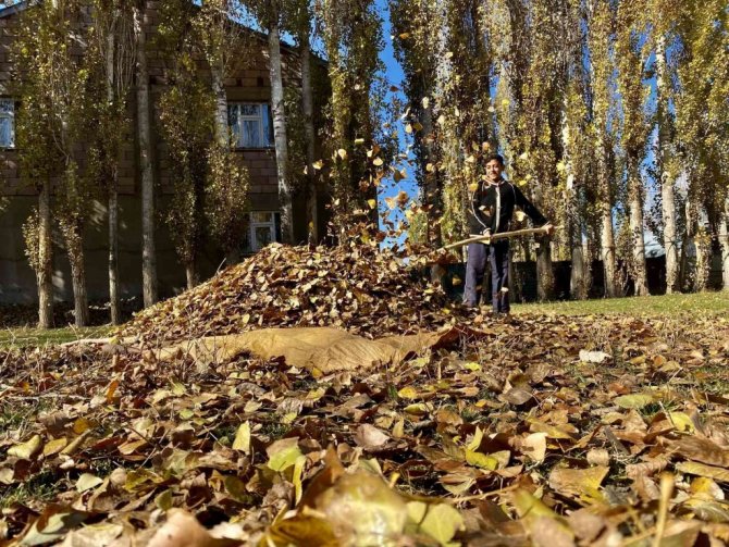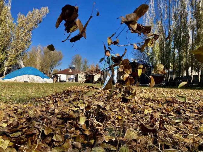 Ağrı'da, sonbahar renklerine boyanan ağaçlardan düşen ve adeta bahçeleri örtü gibi saran yapraklar görsel şölen sundu. Dört mevsimin belirgin bir şekilde gözlemlendiği ve her mevsimin manzarasıyla büyülediği kentte, vatandaşlar bahçelerinde kış temizliği yapmak için kolları sıvadı.