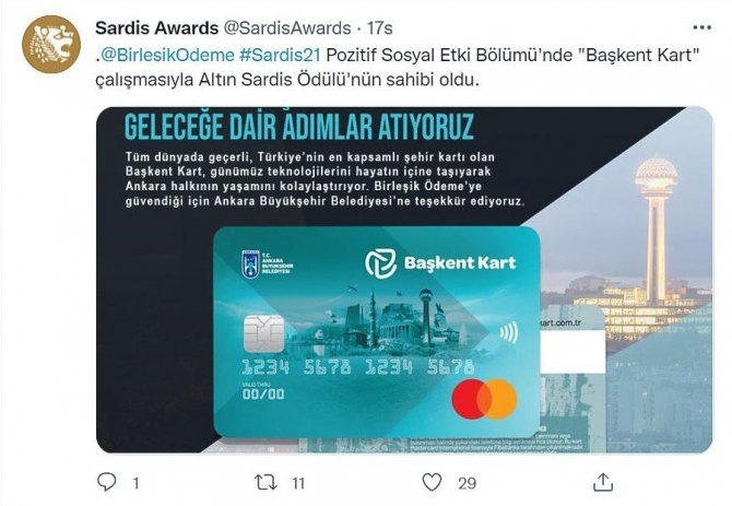Ortak akla değer vererek sosyal sorumluluk projeleri başta olmak üzere vatandaşların hayatını kolaylaştıran birçok yeni uygulamayı hayata geçirmeye devam eden Ankara Büyükşehir Belediye Başkanı Mansur Yavaş'ın yönetim anlayışı, ulusal ve uluslararası birçok kuruluş tarafından ödüle layık görülüyor. Başkent'te "bir elin verdiğini diğeri görmeyecek" diyerek sosyal yardım anlayışını kökten değiştiren Yavaş'ın başlattığı "Başkent Kart" uygulaması "Sardis Ödülleri" kapsamında 3 altın ödüle layık görüldü. Finans dünyasının tüm bileşenlerinin buluştuğu, yenilikçi projelerin ve pazarlama başarılarının ödüllendirildiği ve bu yıl üçüncüsü gerçekleşen Sardis Ödülleri 30 Eylül'de düzenlenen törenle açıklandı. Sunuculuğunu Simge Fıstıkoğlu'nun üstlendiği Sardis Ödülleri töreninde yapılan 225 başvuru sonucunda ödüller; İnovasyon, Finans ve Finans Teknolojilerinin Yenilikçi Kullanımı, Pozitif Sosyal Etki olmak üzere 4 bölüm altında 65 kategoride dağıtıldı. Birçok önemli kuruluşun ödül aldığı Sardis Ödülleri'nde Başkent Kart uygulamasını hazırlayan Birleşik Ödeme Hizmetleri ve Elektronik Para Anonim Şirketi, "Pozitif Sosyal Etki bölümünde"; Toplumsal Sosyal Sorumluluk Altın Ödülü, Ekonomik Sorumluluk Altın Ödülü, Sosyal İnovasyon Altın Ödülün alarak 3 altın ödülün sahibi oldu.