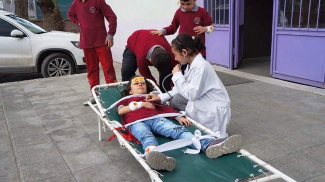 Tatbikat gereği 4 Eylül İlkokulu öğrencileri, çalan siren sesi ile birlikte sınıflarından düzenli şekilde binadan tahliye edilerek bahçede güvenli bölümde yerlerini aldı. Okul bahçesinde temsili olarak çıkarılan yangın da itfaiye ekiplerince anında söndürüldü. Sınıflardaki temsili yaralılar ise sedye yardımı ile dışarıya çıkarılarak, 112 ekipleri tarafından ilk müdahaleleri yapıldı. Okul penceresinde elinde beyaz önlükle yardım isteyen öğrenciyi de itfaiye ekipleri kurtardı.