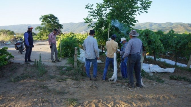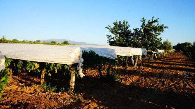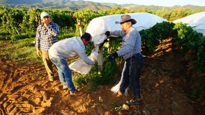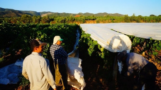 Örtü işi yapan işçiler ise hava şartlarından dolayı erken başlandığını ve günde 30 dönümlük alanın sabah 6’dan öğle 13.00’a kadar tamamladıklarını belirtti. Yapılan çalışmalarla hem sıcaklardan hem de dolu gibi afetlerden üzüm bağlarının korunduğu öğrenildi.