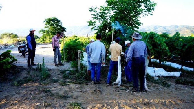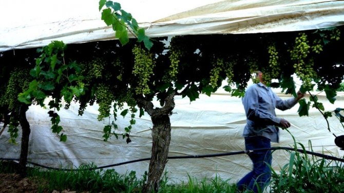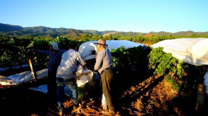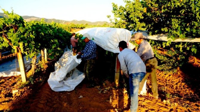 Manisa’nın Sarıgöl ilçesinde hava sıcaklıklarının artmasıyla birlikte üzümlerin uzun süre dalında taze kalmasını isteyen çiftçiler bağlarını beyaz örtülerle kaplamaya başladı.