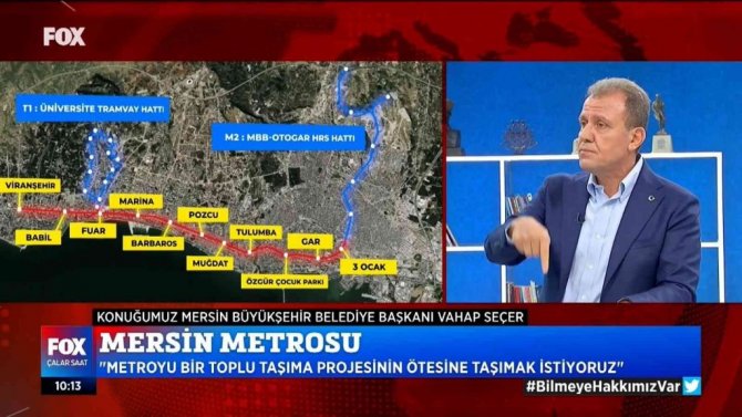 "Mersin çok kozmopolit bir yer. Mersin, Türkiye'nin özeti. Merkezde 4 ilçe var. 4 merkez ilçede sosyokültürel, sosyoekonomik yapı çok farklı. Şimdi yaptığımız 34,4 kilometrelik bir raylı sistem. İlk etapta 13,4 kilometre yeraltından geleceğiz. Doğu-batı aksından yeraltı metrosu. Zaten bize en çok maliyet getirecek olan bu proje. Sonra ikinci etapta Mersin Üniversitesi, Mersin Üniversitesi Hastanesi, o bölge çok hızlı gelişiyor. Orada da 8,4 kilometrelik bir tramvay hattı, bir ring düşünüyoruz. Yine metroya bağlayacağız. Şu anda ilk etapta, birinci etabın doğu noktasında, Tren Garının olduğu, eski otogarın olduğu bölgeden de Şehir Hastanesine ve yeni otogara çıkacağız."