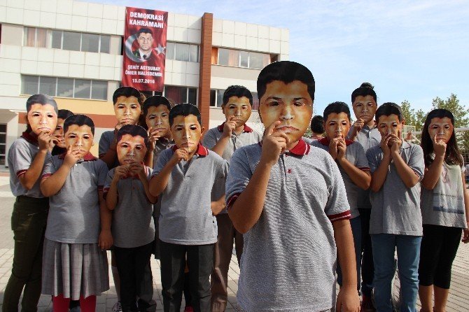 Öğrencilerin ve öğretmenlerin de darbe girişimi ve verilen şehitlerle ilgili yaptıkları konuşmaların ardından okulda eğitim öğretim gören bin 100 öğrenci yüzlerine Şehit Ömer Halisdemir’in fotoğrafının yer aldığı maskeleri takarak ‘Hepimiz Ömer’iz sloganı attı.