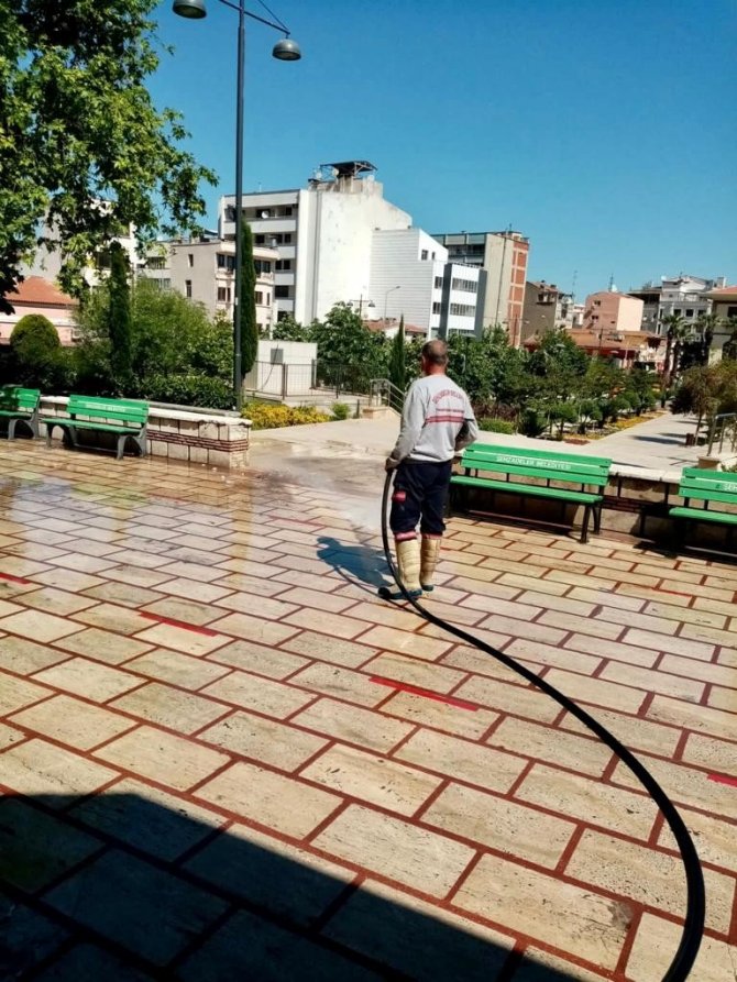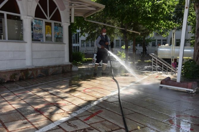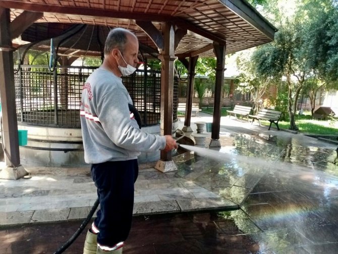 Şehzadeler Belediyesi Temizlik İşleri Müdürlüğüne bağlı ekipler, bayram namazı öncesinde Şehzadeler'deki camilerde hummalı bir temizlik çalışması başlattı. Pandemi nedeni ile sosyal mesafe kurallarına uygun bir şekilde kılınacak namaz öncesinde belediye ekipleri cami bahçelerinde detaylı bir yıkama ve temizlik çalışması başlattı.