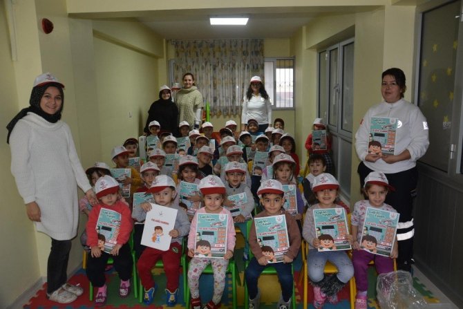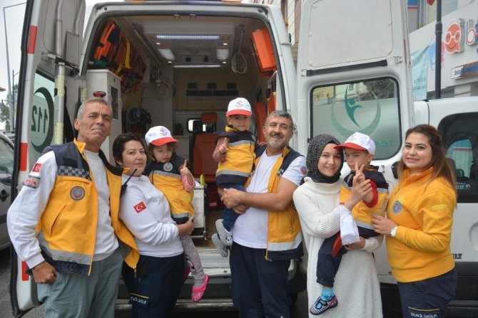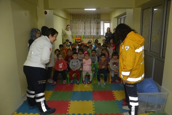 Şehzadeler Belediyesi Çocuk Kreşi ve Gündüz Bakımevinde eğitim gören minikler, 112 Acil Çağrı Merkezi ve acil ambulansın önemini öğrendi.