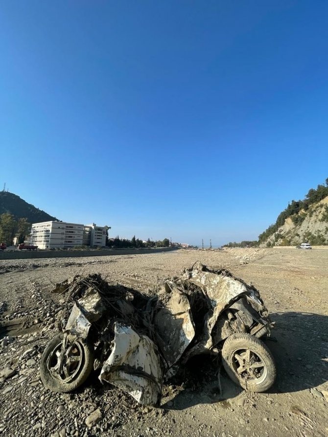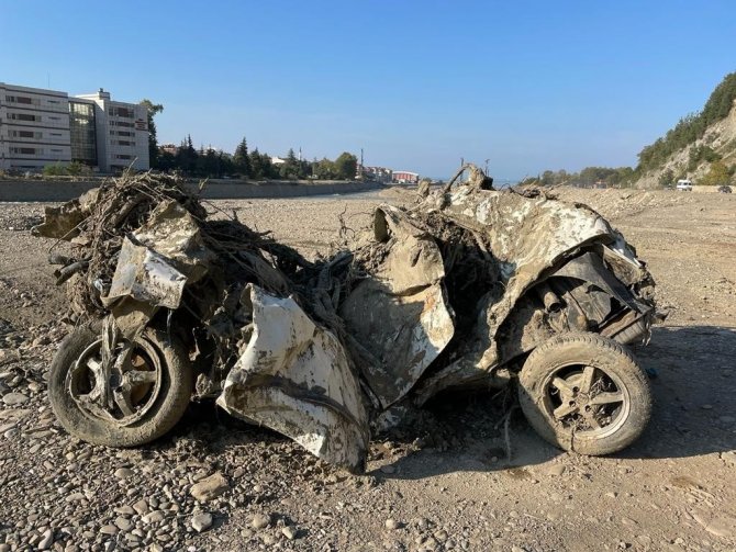 Sinop'un Ayancık ilçesinde 11 Ağustos'ta yaşanan sel nedeniyle Köprübaşı mevkiinde kalan hurdaya dönmüş bir otomobil dikkat çekiyor.
