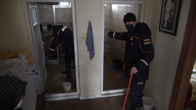 Suların çekilmesiyle Afet ve Acil Durum Yönetimi Başkanlığı (AFAD) görevlileri bu kez de vatandaşların evlerini temizlik için kolları sıvadı. AFAD ekiplerinin yardıma geldiklerini dile getiren Ayşegül Duran, suların birden geldiğini belirterek, "Ben işteydim. Beni aradılar, su geliyor dediler. Hemen geldik, evdeki halıları kaldırdık. Sonra dışardan taş getirdik, eşyaların altına koyduk ama olmadı. Tekrar içeri girdik, odalara baktık, köpür köpür sular geliyor. Temelden girdi. Şu anda AFAD ekipleri geldi, yardımcı oluyorlar Allah razı olsun. Zaten elimiz ayağımız tutmuyor" dedi.