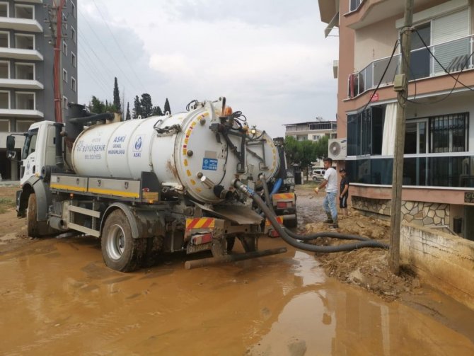 Bölgede afet nedeni su biriken zemin ve giriş katları vidanjörler ile boşaltılmasının ardından Nazilli Belediyesi ekipleri kapsamlı olarak temizledi.