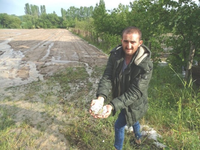 Hasanlar köyünde şiddetli yağmur ve dolu sonucu oluşan sel sularının yüzlerce dönüm ekili alanı sular altında bıraktığı, ayrıca dolunun sebze, meyve ve üzüm bağlarında zarara yol açtığı öğrenildi.