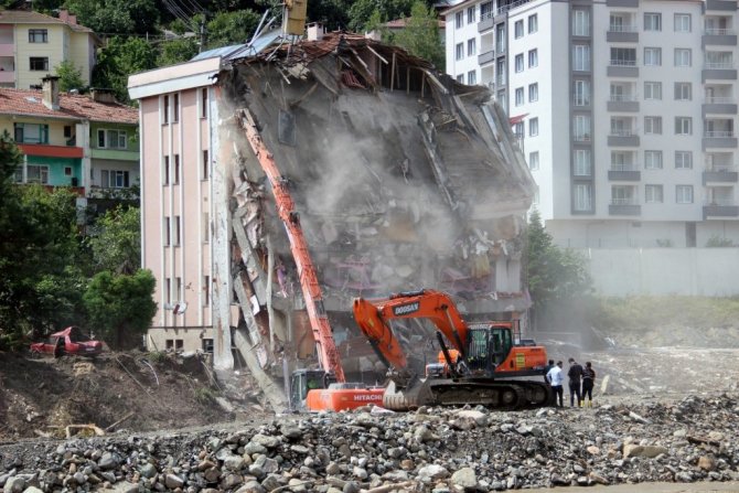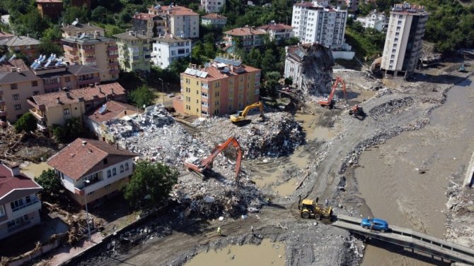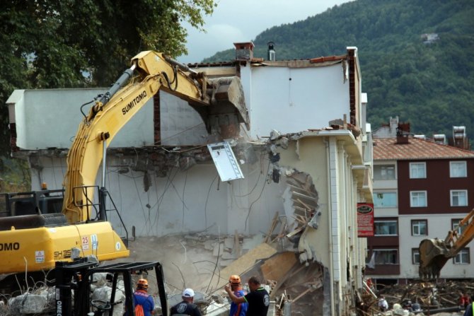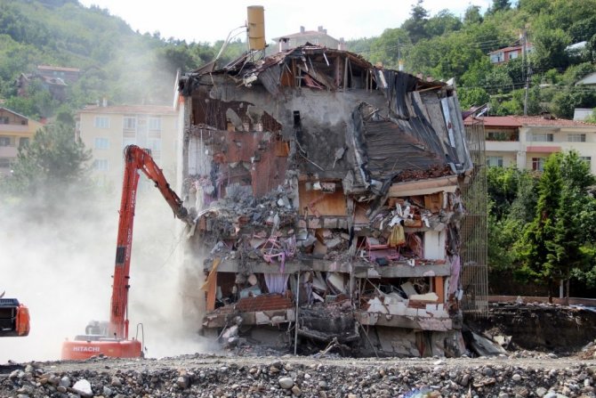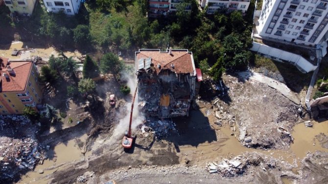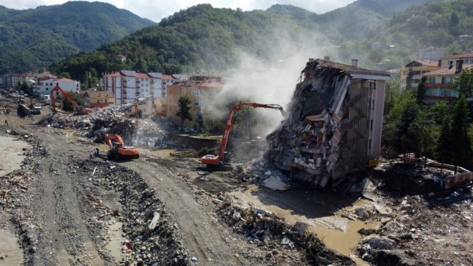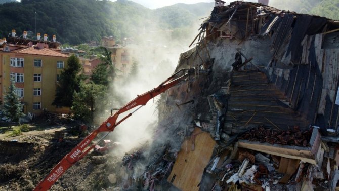 Kastamonu'nun Bozkurt ilçesindeki sel felaketinde ağır hasar alarak çöken ve selin boyutunu gözler önüne seren kız yurdunun yıkımı gerçekleştiriliyor. Yıkım çalışmaları havadan da görüntülenirken, ilçe genelinde hasar alan diğer binalarında yıkım işlemleri gerçekleştiriliyor.