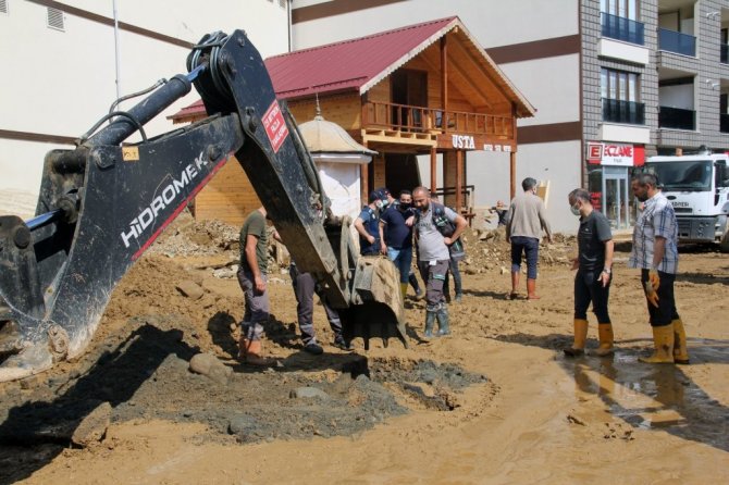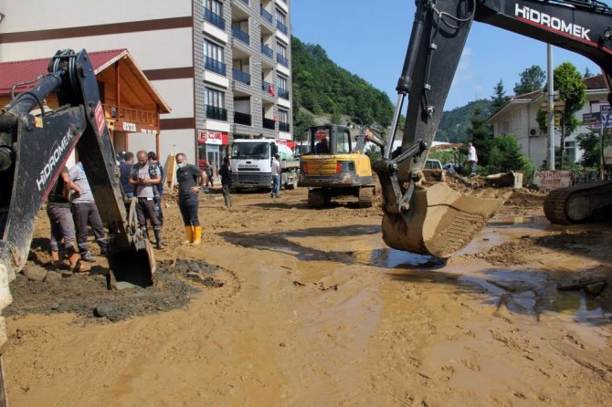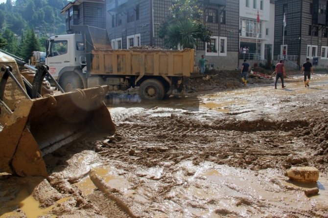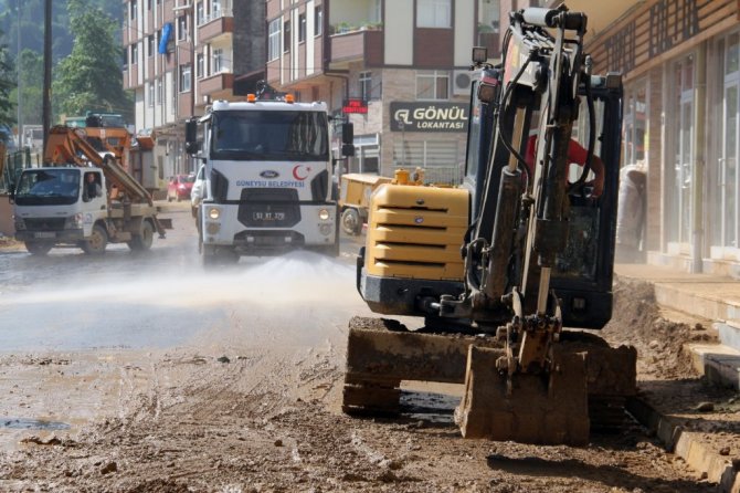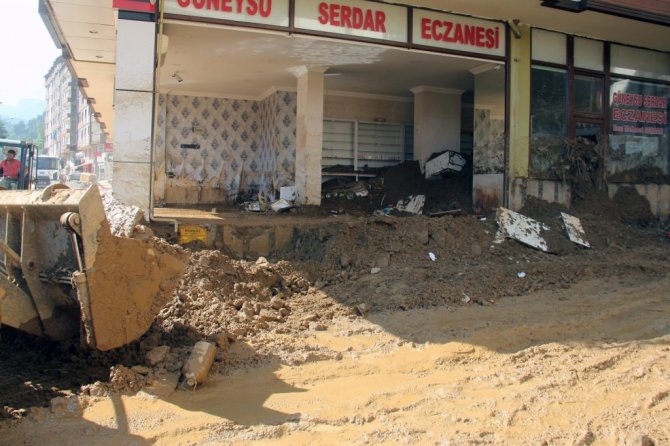 Rize'de selden en fazla etkilenen Güneysu ilçe merkezindeki iş yerlerinin ve dükkanların temizlik çalışması devam ediyor. Temizlik çalışmalarına Güneysu belediyesinin yanı sıra Trabzon Büyükşehir Belediyesi başta olmak üzere diğer belediyelerden gelen personeller de destek veriyor. İlçe merkezinde Adnan Menderes Caddesi üzerinde selin getirdiği moloz yığınlarının dün kaldırılmasının ardından bu sabah saatlerinde ise yıkama ve temizlik çalışmaları başlatıldı. İş makinaları çamurları temizleyip yıkama yaparken, işyerlerindeki hasar tespit çalışmalarına da başladı.