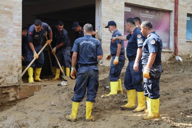 Rize'de selden en fazla etkilenen Güneysu ilçe merkezindeki iş yerlerinin ve dükkanların temizlik çalışması devam ediyor. Temizlik çalışmalarında İl Jandarma Komutanlığına bağlı ekipler de aktif rol alırken, Güneysu Belediyesi'nin yanı sıra çevre belediyelerden gelen personeller de destek veriyor.