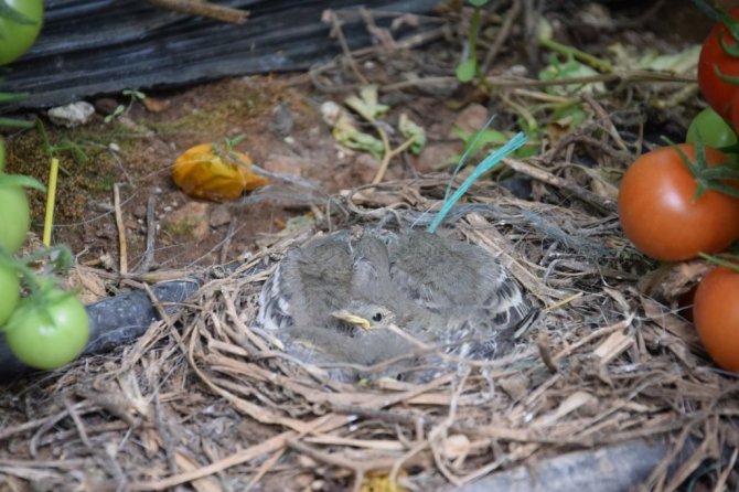 Serasının içine kuşlar tarafından yuva yaptığını gördükten sonra serasının içinde daha dikkatli işçilik yapan İrfan Oktay, "Kuşların yuva yaptığını 15 gün önce gördük. Hemen koruma altına aldım. Yavrular üşümesin veya yumurtalar bozulması diye sebzelerin suyunu az verdim. Çünkü bunlar artık bir canlıydı. Seraların içi dışarıdan daha güvenli olduğu için yılanda, yırtıcı kuşlardan korunmak için buraya yuva yapıyorlar. Her sene yuva yapıyorlar. Geçen 3 tane yavru vardı. Bu yıl 6 tane misafirimiz oldu. Zirai ilaç bakımından bu kuşlar da burada yaşayabiliyor. Zaten arılar da çalışıyor. Sebzelerimizi güvenle yiyebilirisiniz. Zehir diye bir şey yok yani. Kuşlar en güvenli yer olduğu için gelip yuvayı burada yapıyorlar. Her yıl gelip seralarımıza yuvalarını yapıp yavrularını büyütüp uçup gidiyorlar" dedi.