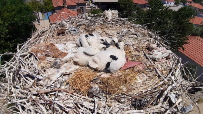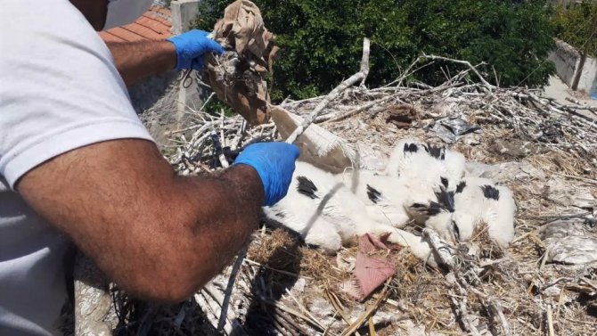 Aydın'ın Söke ilçesindeki leylek yavruları büyümeye başlarken, çevresel atıklar sebebiyle yavruların sıkıntılı günleri de başladı.