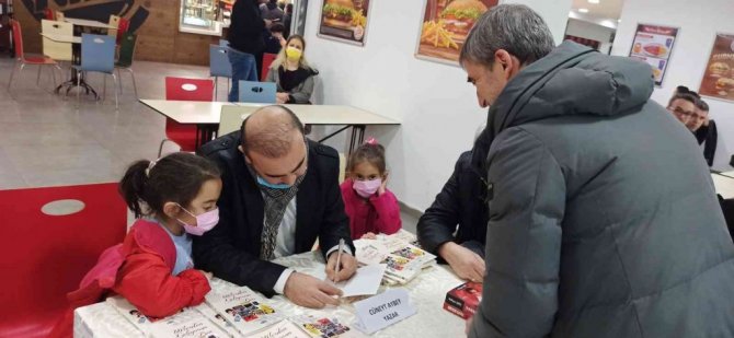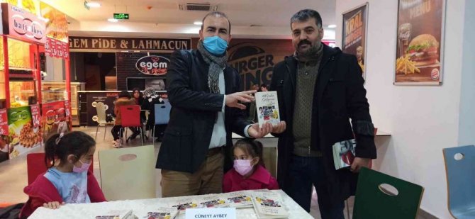Manisa'nın Turgutlu ilçesindeki kitap fuarında Eğitimci Yazar Cüneyt Aybey, okurları için ikizleriyle birlikte kitaplarını imzaladı.
